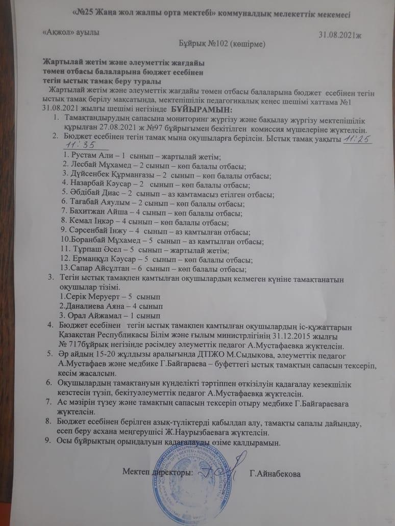 Бюджет есебінен тегін ыстық тамақтандыру бұйрық » "№25 Жаңа жол ЖББМ" КММ