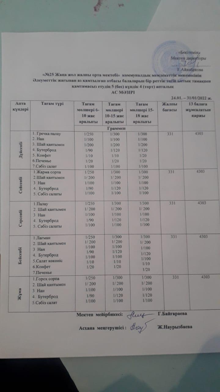 Ас Мәзірі Қаңтар айы » "№25 Жаңа жол ЖББМ" КММ